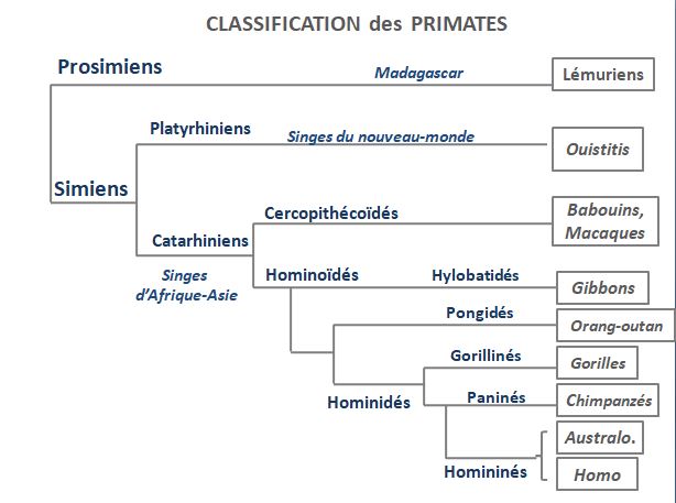 Parmi ces derniers singes, on distingue la grande famille des Cercopithécoïdés (ou singes cynomorphes à queue non-préhensile comme les Babouins, les Macaques, les Colobes) et celle des Hominoïdés ( les "grands" singes sans queue, comme les Gibbons, Orang-Outans, Gorilles, Chimpanzés et Bonobos, Australopithèques et Humains).