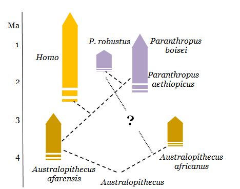 A. afarensis apparait actuellement comme l'ancêtre du genre Homo et sans doute également celui des Paranthopus robustus.