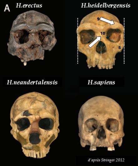 Actuellement seulement quatre ou cinq sites européens ont livrés des restes humains permettant de définir Homo heidelbergensis, une lignée qui se met en place progressivement par accrétion des caractères qui conduiront aux Néandertaliens proprement dit.