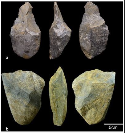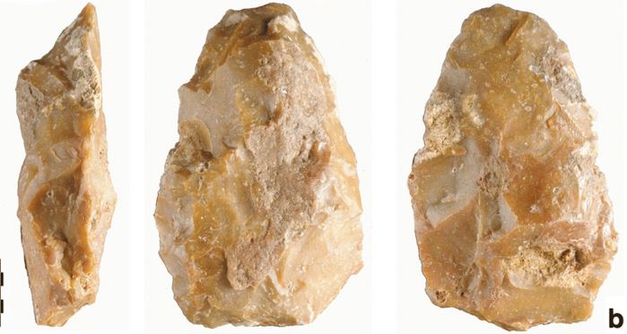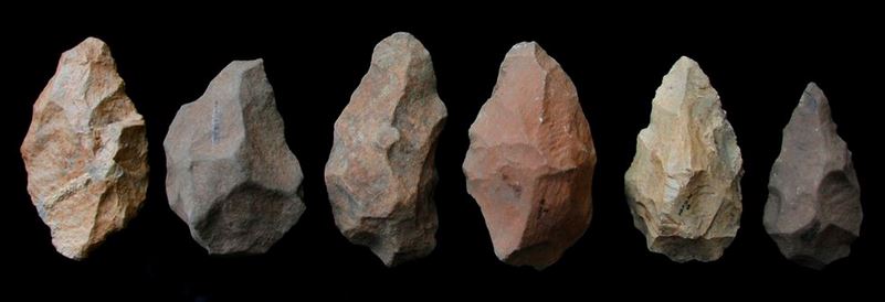A ce jour, les plus anciens outils Acheuléens proviennent de Konso au sud de l’Éthiopie et sont datés de 1.75 à 1.6 et 1.25 Ma. (de gauche à droite) (3)