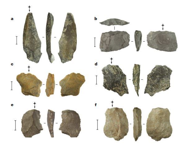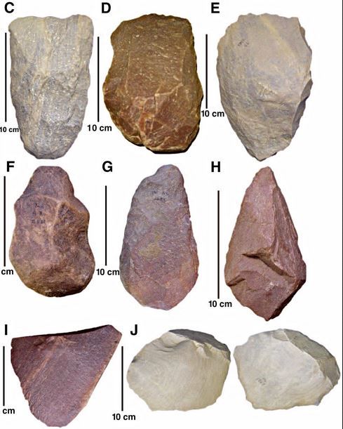 Les pierres taillées dans le silex et le basalte qui accompagnent ces fossiles sont du type début Acheuléen: