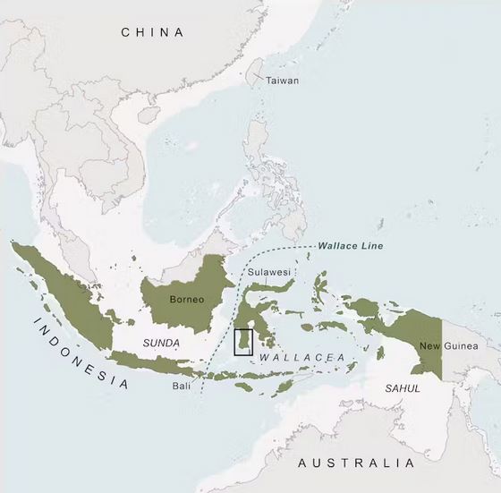 Les hommes modernes ont traversé le Wallacea, passé de la partie continentale Sunda vers le Sahul (Australie+Nouvelle-Guinée) il y a au moins 50.000 ans (28) et possiblement 65.000 ans (31).