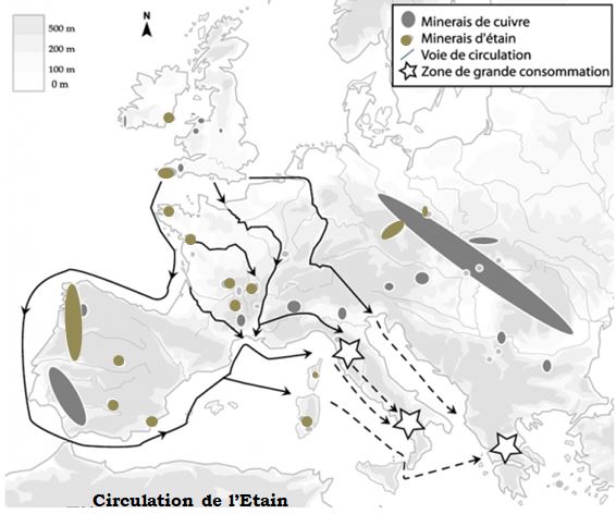 De la, des routes commerciales terrestres et maritimes distribuaient l’étain d’Ouest en Est à travers l’ensemble du monde méditerranéen, routes dont les Vénètes d’Armorique étaient le maillon initial incontournable.